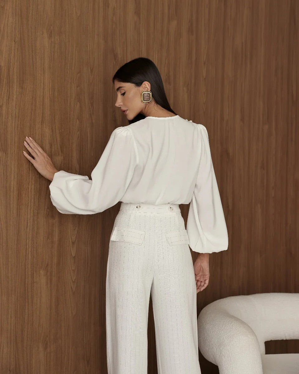 Calça de alfaiataria risca de giz é um clássico repaginado, ideal para composições elegantes e sofisticadas. Com modelagem reta e caimento impecável, alonga a silhueta e confere um ar contemporâneo ao visual. A cintura alta valoriza a feminilidade e proporciona conforto e segurança ao vestir. O tecido estruturado com leve textura e as discretas riscas verticais reforçam a proposta clássica, enquanto os bolsos laterais e traseiros com acabamento embutido garantem funcionalidade e elegância. Versátil, transita facilmente do office look às produções mais refinadas, sendo perfeita para quem busca estilo e atemporalidade em uma só peça.