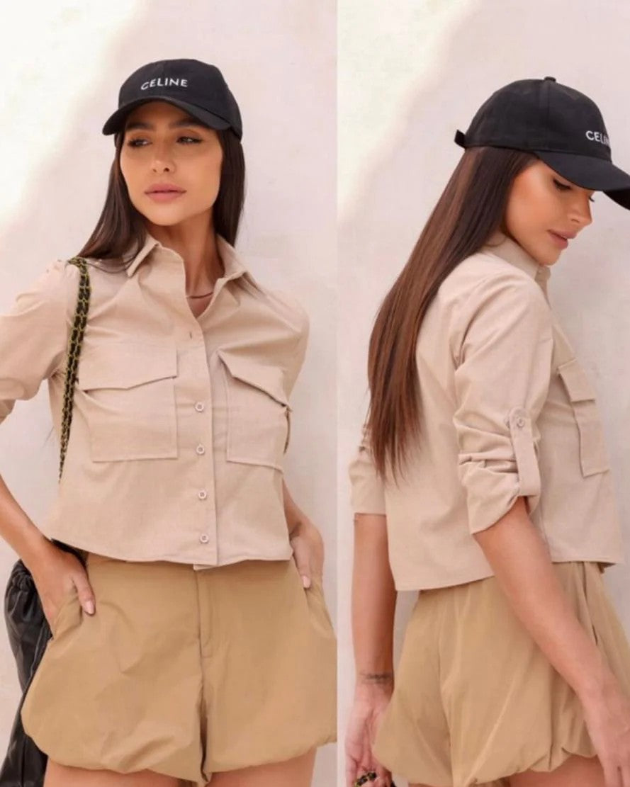 A camisa trendy que traduz estilo com atitude! Com shape cropped e toque moderno, essa peça traz bolsos frontais oversized que garantem personalidade ao look. Feita em tecido leve com caimento estruturado, ela conta com abotoamento frontal delicado e mangas com opção de dobra e botão de ajuste — perfeita para compor visuais urbanos e cheios de estilo. Ideal para quem ama praticidade com sofisticação, essa camisa vai do casual ao chic com facilidade.