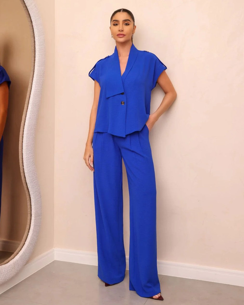 Este conjunto azul royal é a escolha ideal para quem deseja um visual elegante, contemporâneo e confortável, sem abrir a mão da sofisticação. Com um design que equilibra estrutura e leveza, ele é perfeito para dias de trabalho ou momentos casuais com um toque de aula. A blusa possui uma modelagem ampla e moderna, com gola larga e lapela estruturada, trazendo um ar refinado e atual. O detalhe de amarração nas costas permite ajuste na cintura, valorizando a silhueta com sutileza e charme. Já o botão frontal garante praticidade e estilo, destacando a peça com um toque minimalista. O calça de corte reto e tecido leve proporciona fluidez ao look, garantindo conforto ao longo do dia sem perder a roupa. O caimento solto aliado ao código ajustado valoriza diferentes tipos de corpo, tornando esse conjunto uma aposta versátil e atemporal.