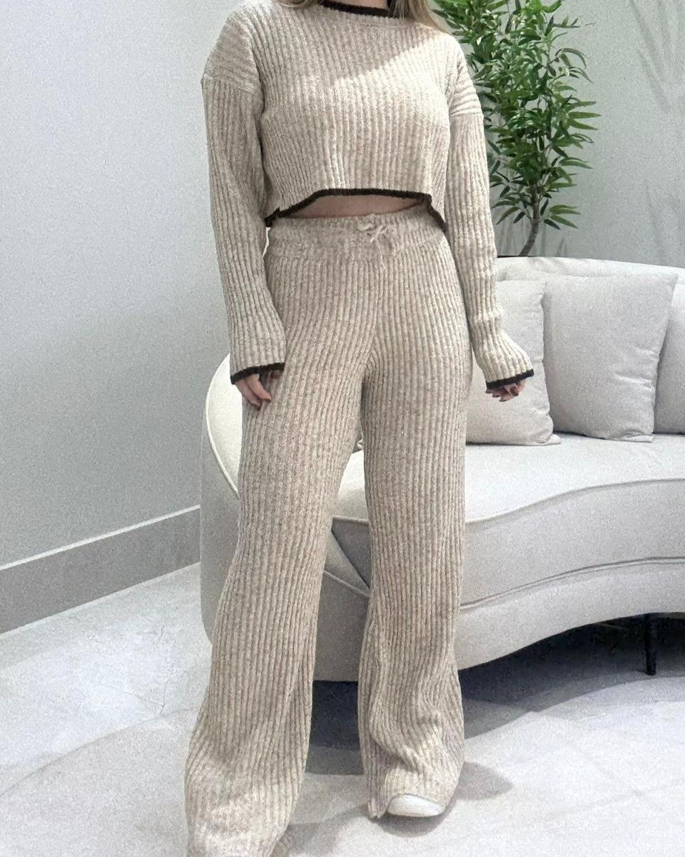 Este conjunto é a definição do estilo comfy com sofisticação, ideal para quem busca elegância descomplicada no dia a dia. Confeccionado em malha canelada de toque supermacio e aconchegante, o modelo alia conforto térmico e caimento fluido, sendo perfeito para as temperaturas amenas. A blusa apresenta modelagem cropped com caimento soltinho, valorizando a silhueta de forma sutil e moderna. O charme fica por conta do acabamento em viés contrastante preto no decote e barra, que cria um efeito visual delicado e atual. As mangas longas com ombro levemente deslocado reforçam a proposta relaxada da peça, sem abrir mão da estrutura. A calça acompanha o mood comfy chic com shape reto e fluido, em estilo pantalona. O cós com elástico embutido e cordão ajustável proporciona caimento perfeito à cintura, garantindo conforto e versatilidade ao vestir. A textura canelada vertical alonga visualmente a silhueta, favorecendo todos os biotipos. Ideal para momentos de lazer, home office ou produções casuais elegantes, o conjunto transita com facilidade entre o básico elevado e o moderno minimalista. Combine com tênis e bolsa transversal para um visual urbano e despojado, ou aposte em botas e maxi acessórios para transformar a proposta com muito estilo.