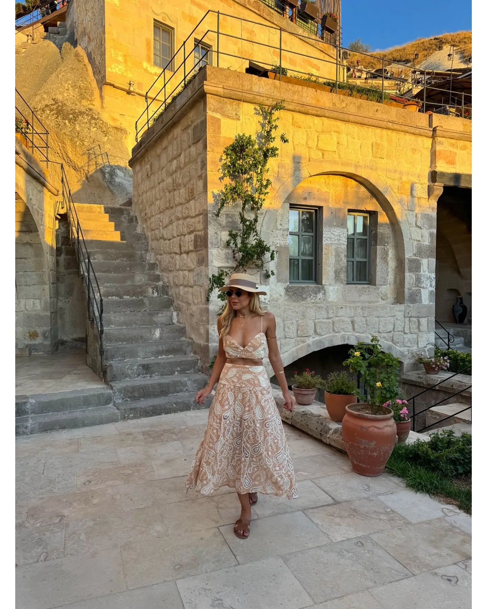 Um verdadeiro clássico do verão com toque artesanal e sofisticação atemporal. Esse conjunto longuete foi cuidadosamente confeccionado em algodão com bordado nobre, trazendo textura e riqueza de detalhes que transformam o look em uma peça única. O forro em tecido de algodão garante conforto e leveza — perfeito para climas quentes e ocasiões especiais ao ar livre. O top, com decote estruturado e alças finas, tem elástico nas costas, proporcionando ajuste perfeito ao corpo com suavidade e liberdade de movimento. A saia longuete é o grande destaque visual: seu comprimento elegante e a transparência sutil do bordado criam um efeito leve e encantador, ideal para passeios à luz do dia ou produções refinadas em resorts.
