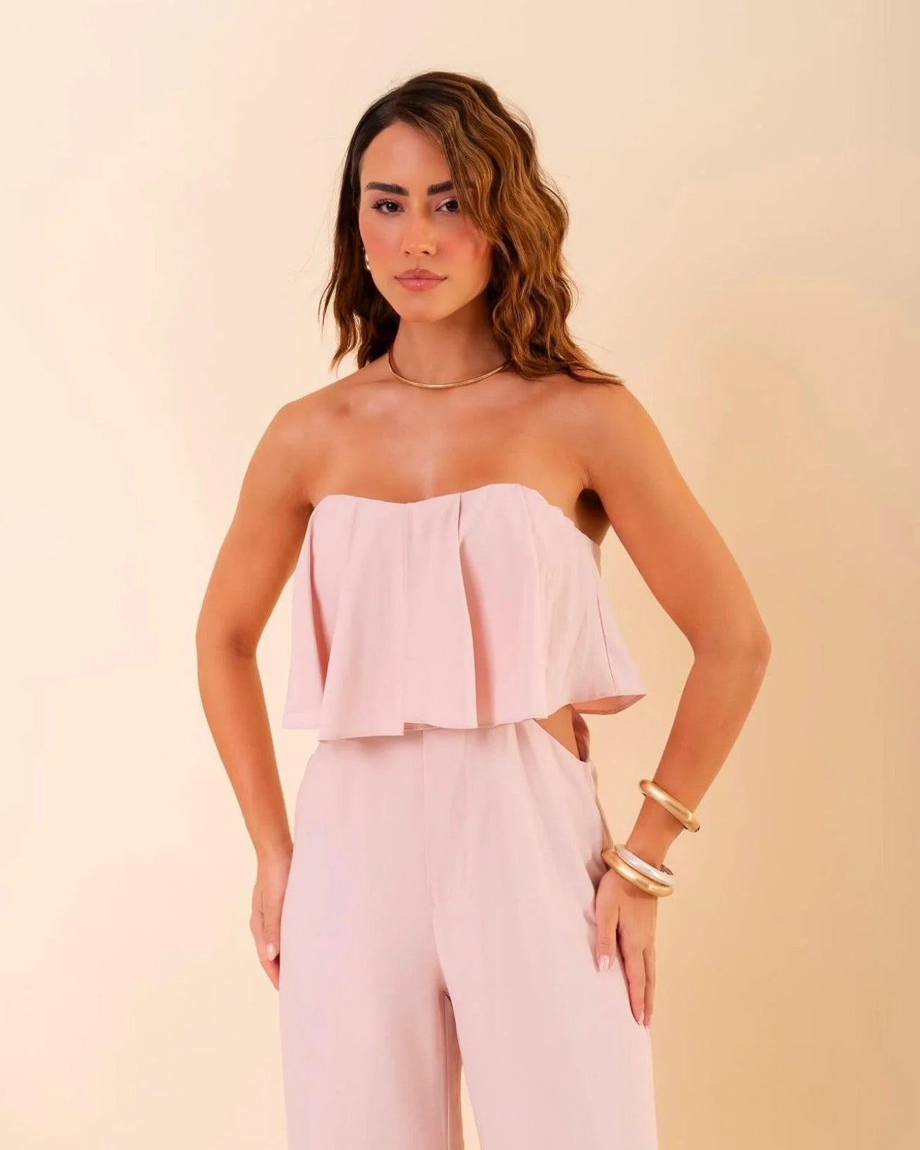Uma proposta leve e sofisticada com toque contemporâneo, este macacão tomara que caia em tom rosa claro é a escolha ideal para composições elegantes e descomplicadas. Com recortes estratégicos e caimento fluido, ele une frescor e feminilidade em um visual versátil para diversas ocasiões. O busto com babado duplo traz movimento e delicadeza, enquanto os recortes laterais adicionam charme e sensualidade na medida certa. A modelagem pantalona equilibra a silhueta com sofisticação, criando um efeito alongador e fluido que valoriza o corpo com leveza. Confeccionado em tecido leve e macio, o macacão oferece conforto térmico ideal para os dias mais quentes, sem abrir mão da elegância. A tonalidade rosa suave transmite frescor e feminilidade, sendo perfeita tanto para ocasiões diurnas quanto para eventos mais casuais à noite.