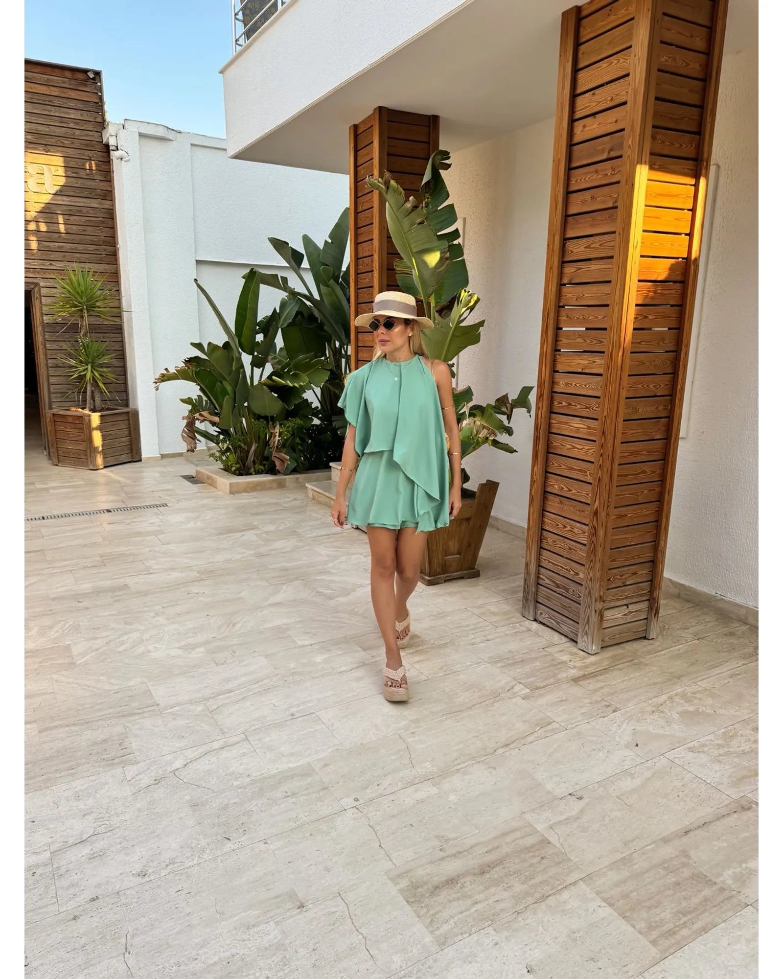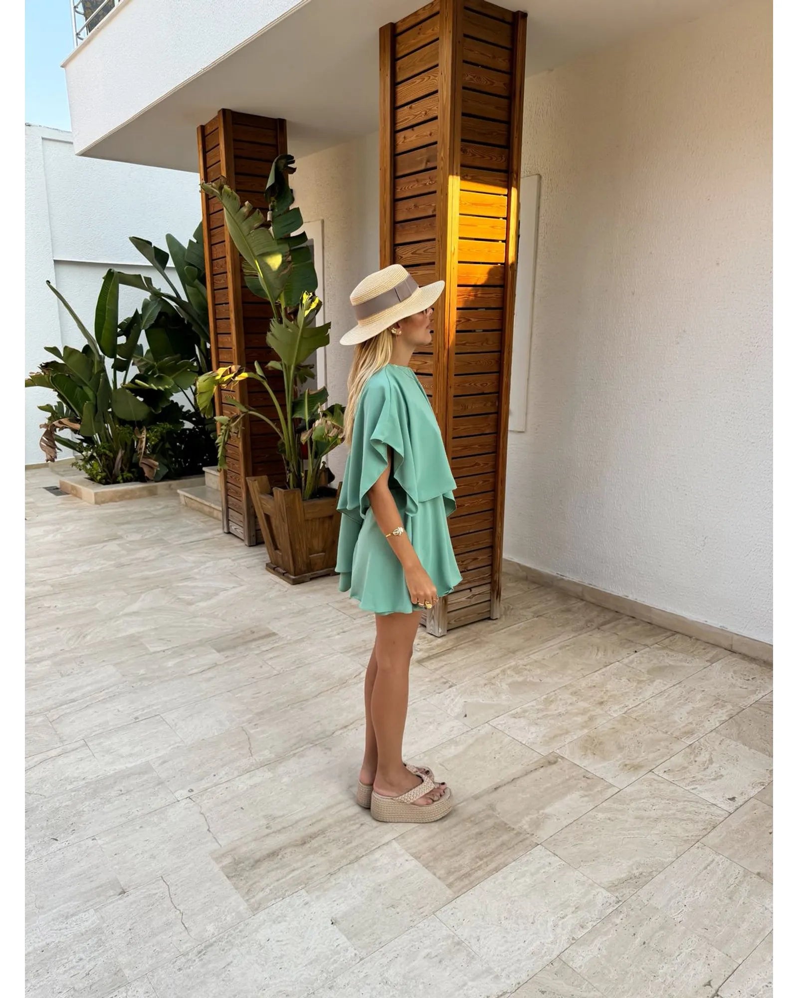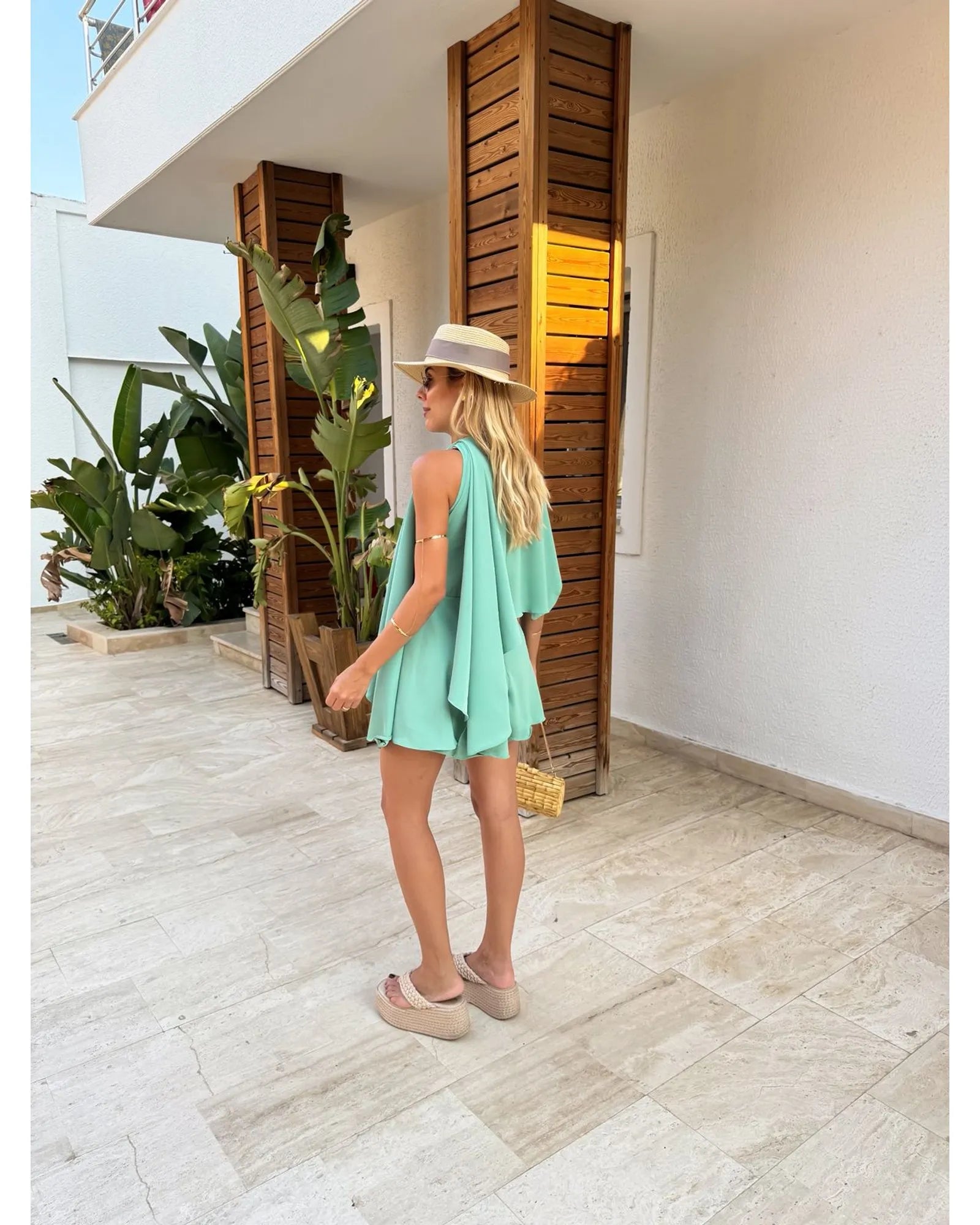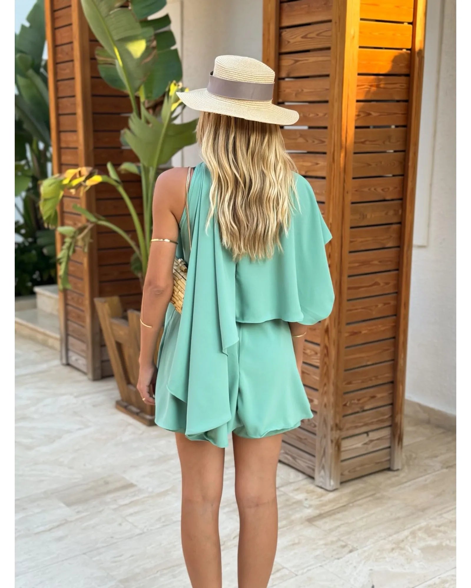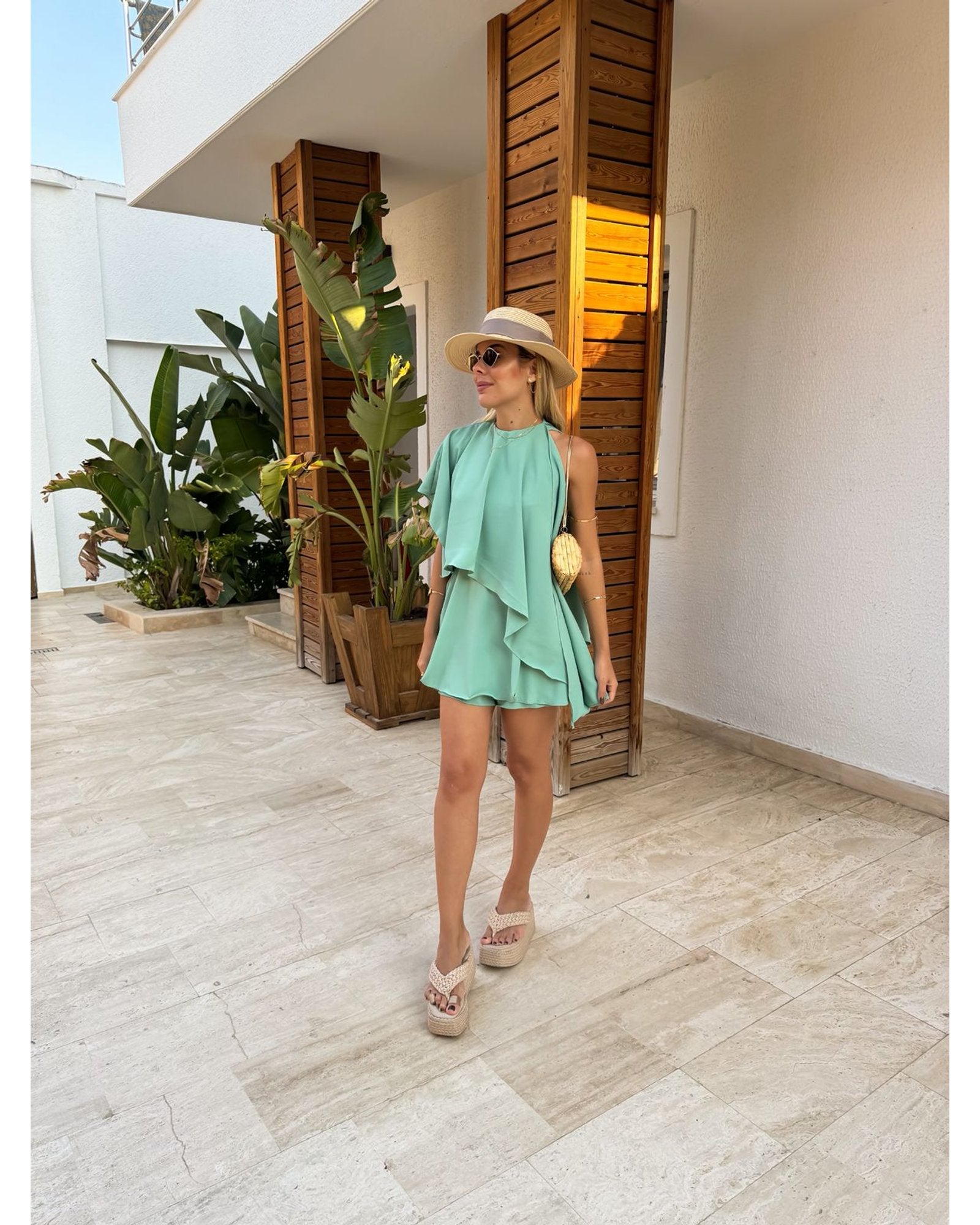 O Macaquinho Euphoria Verde traduz frescor, leveza e elegância em uma única peça. Confeccionado em crepe com toque de seda, o tecido proporciona movimento fluido e caimento sofisticado, perfeito para dias ensolarados e ocasiões que pedem praticidade sem abrir mão do estilo. Seu design moderno aposta em camadas frontais que criam um efeito de movimento delicado, trazendo charme e sofisticação. A modelagem sem mangas valoriza os ombros, enquanto o decote fechado mantém a proposta clean e refinada. Nas costas, o fechamento em botão na parte superior aliado ao zíper invisível na parte inferior garante um ajuste perfeito e discreto. O comprimento curto e a fluidez do tecido tornam a peça versátil e fresh, ideal para combinações tanto casuais quanto sofisticadas.
