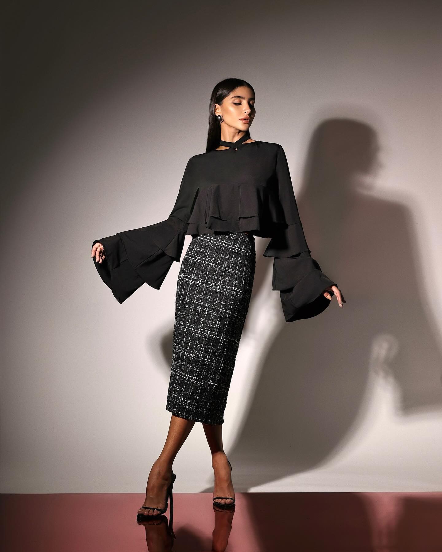 • Saia modelo midi, com comprimento elegante que valoriza a silhueta