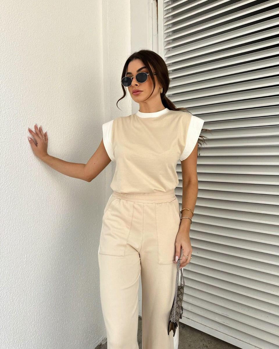 Aquela peça versátil que transforma qualquer produção! A T-shirt sem mangas bicolor na tonalidade areia é confeccionada em algodão egípcio de altíssima qualidade, trazendo maciez incomparável e um caimento impecável. Sua modelagem clássica — nem ampla, nem slim — valoriza a silhueta sem marcar, garantindo conforto absoluto do dia à noite. O detalhe bicolor confere um toque moderno e minimalista, tornando-a perfeita para compor desde looks casuais até combinações mais elegantes com alfaiataria ou peças statement. Essencial no closet de quem valoriza estilo atemporal com informação de moda na medida certa.