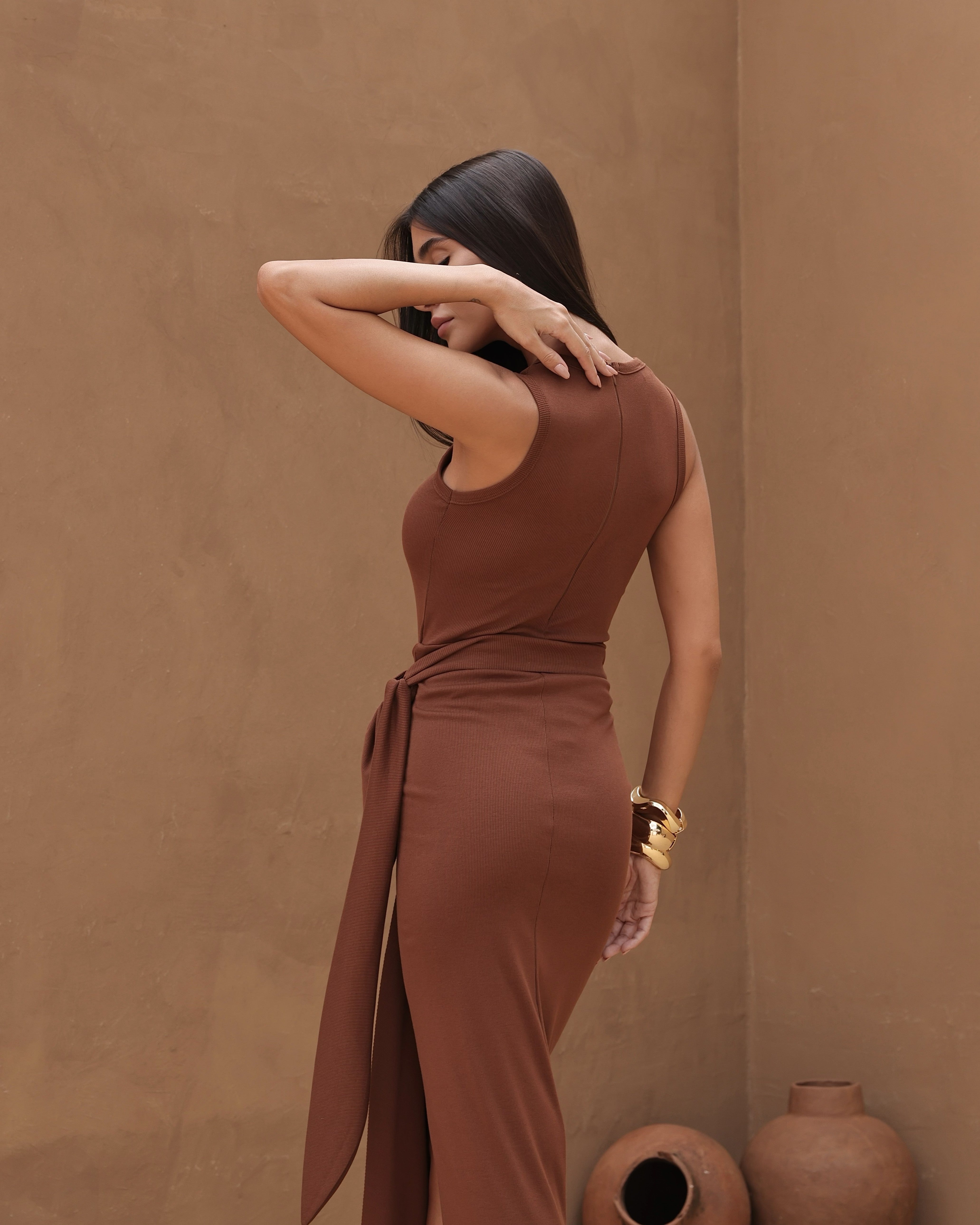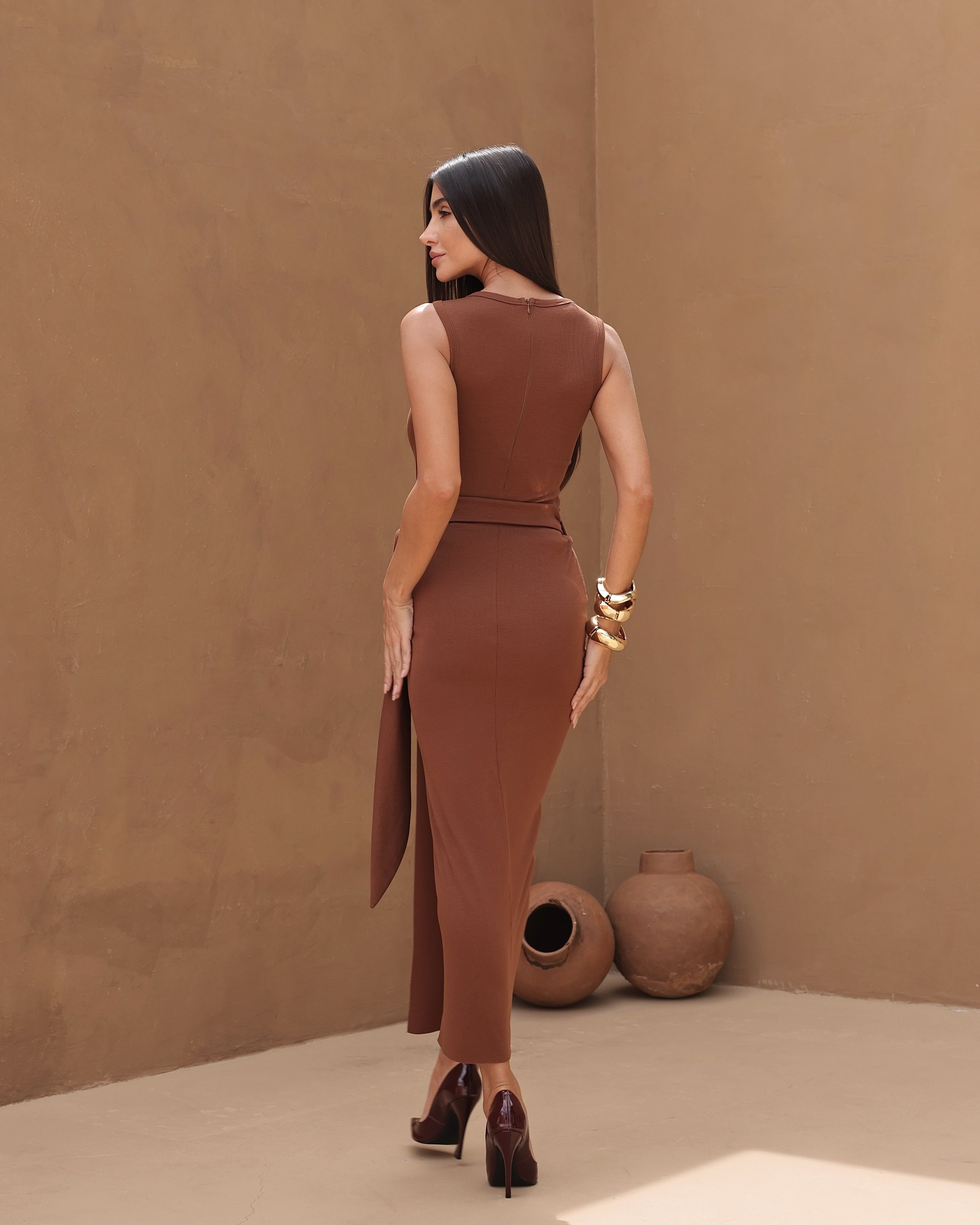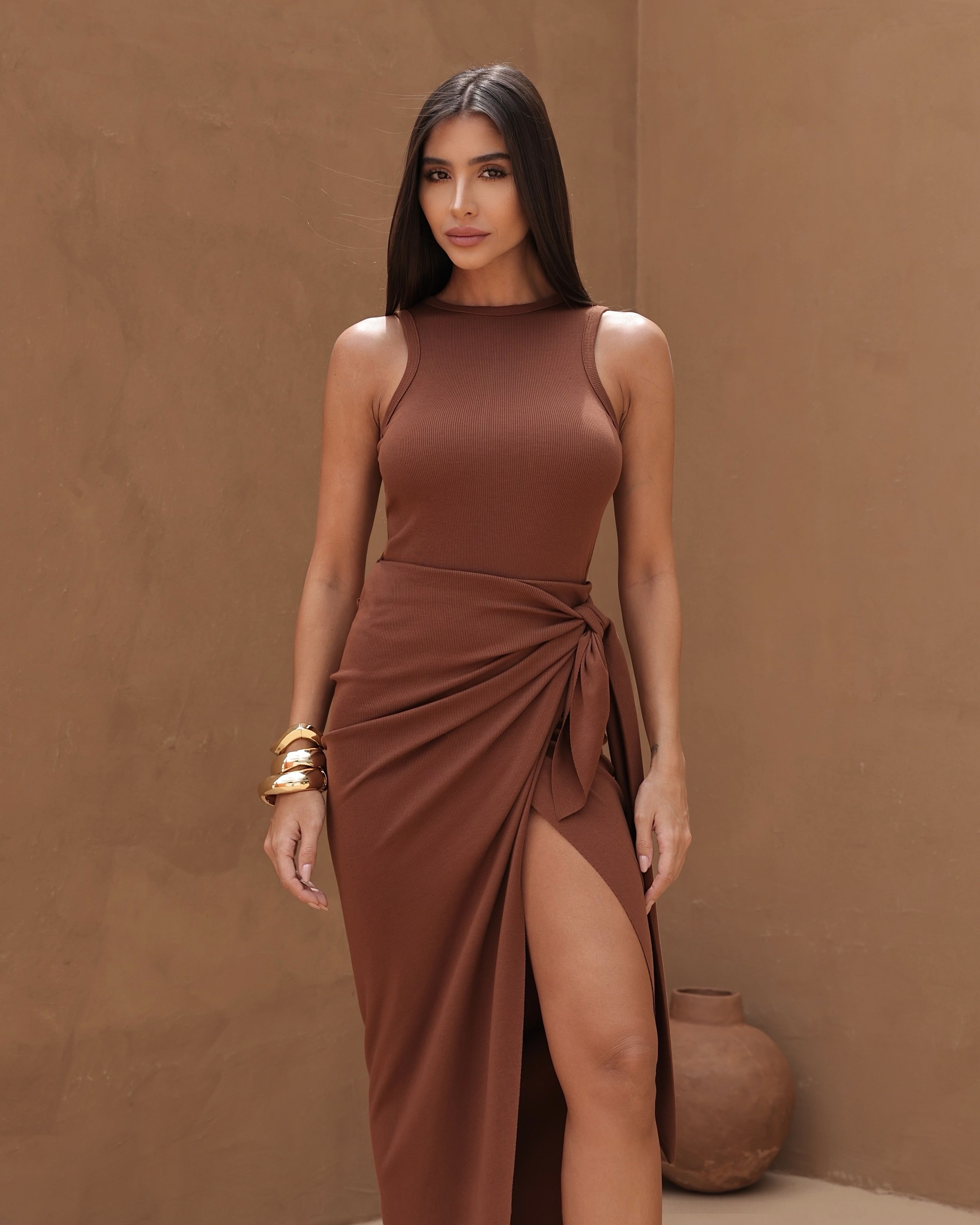 Um design sofisticado, que valoriza a silhueta com naturalidade e elegância. O Vestido Midi com Saia Envelope une a estrutura de um body ao charme fluido da saia transpassada. Possui decote U alto, modelagem sem mangas e detalhe de tiras laterais para amarração, criando um efeito assimétrico e atual. A fenda frontal adiciona movimento e sensualidade na medida certa. Confeccionado em tecido com elastano, proporciona conforto e ajuste impecável. O fechamento prático por zíper nas costas e colchetes na parte inferior do body garante segurança e discrição. Peça statement, para quem busca um visual contemporâneo e marcante.