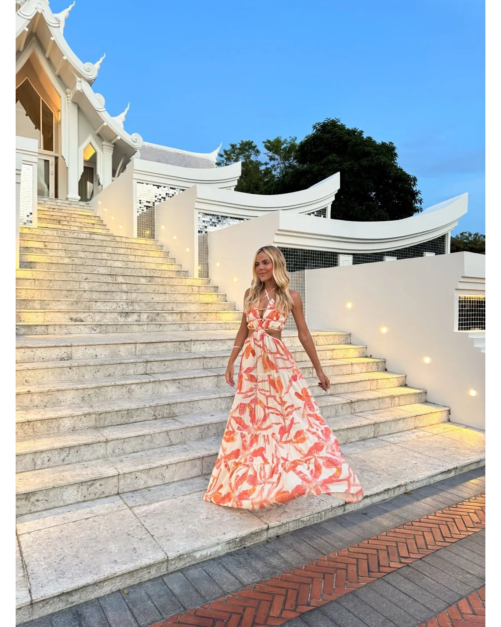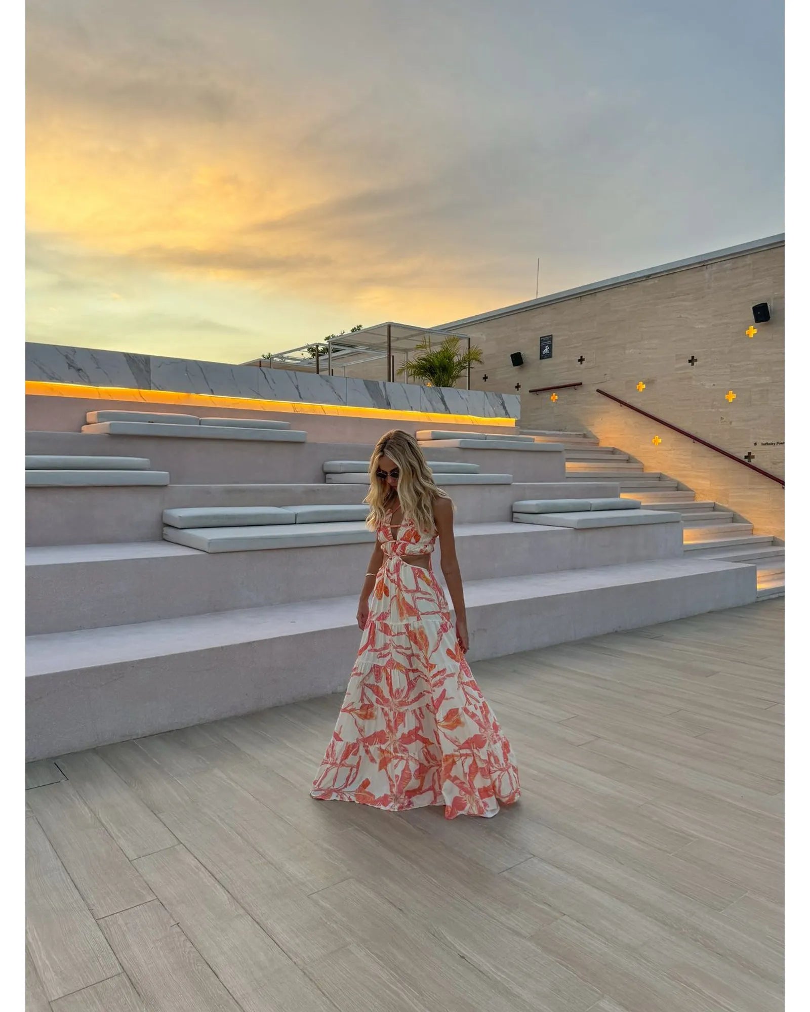 Um vestido que traduz feminilidade, frescor e sofisticação em cada detalhe. Confeccionado em viscose leve e fluida, forrado, garantindo conforto e segurança sem perder a leveza do caimento. A estampa com inspiração tropical e cores vibrantes que iluminam a produção. O busto franzido com delicado detalhe de babadinho adiciona romantismo à peça, enquanto os recortes estratégicos na cintura proporcionam sensualidade equilibrada. O grande destaque fica por conta do decote nas costas com amarração em tiras finas, que confere modernidade e charme, além de permitir melhor ajuste ao corpo. A saia longa e esvoaçante acompanha o movimento, criando uma silhueta elegante e sofisticada. Versátil e impactante, é a escolha ideal para ocasiões especiais, jantares ao pôr do sol, viagens e eventos que pedem um look com presença marcante e frescor contemporâneo.