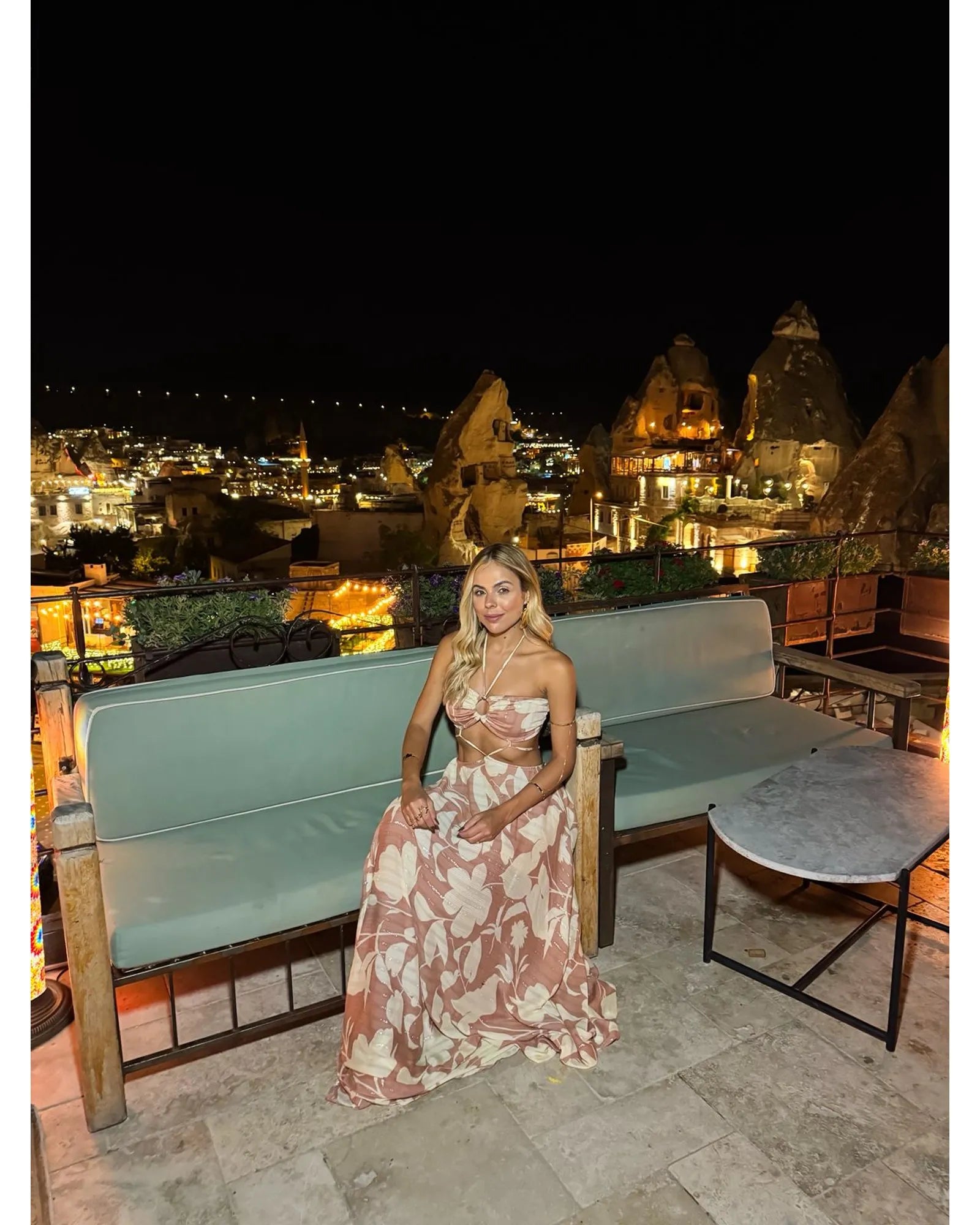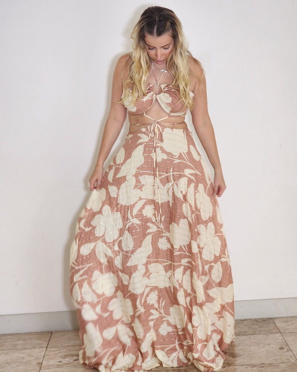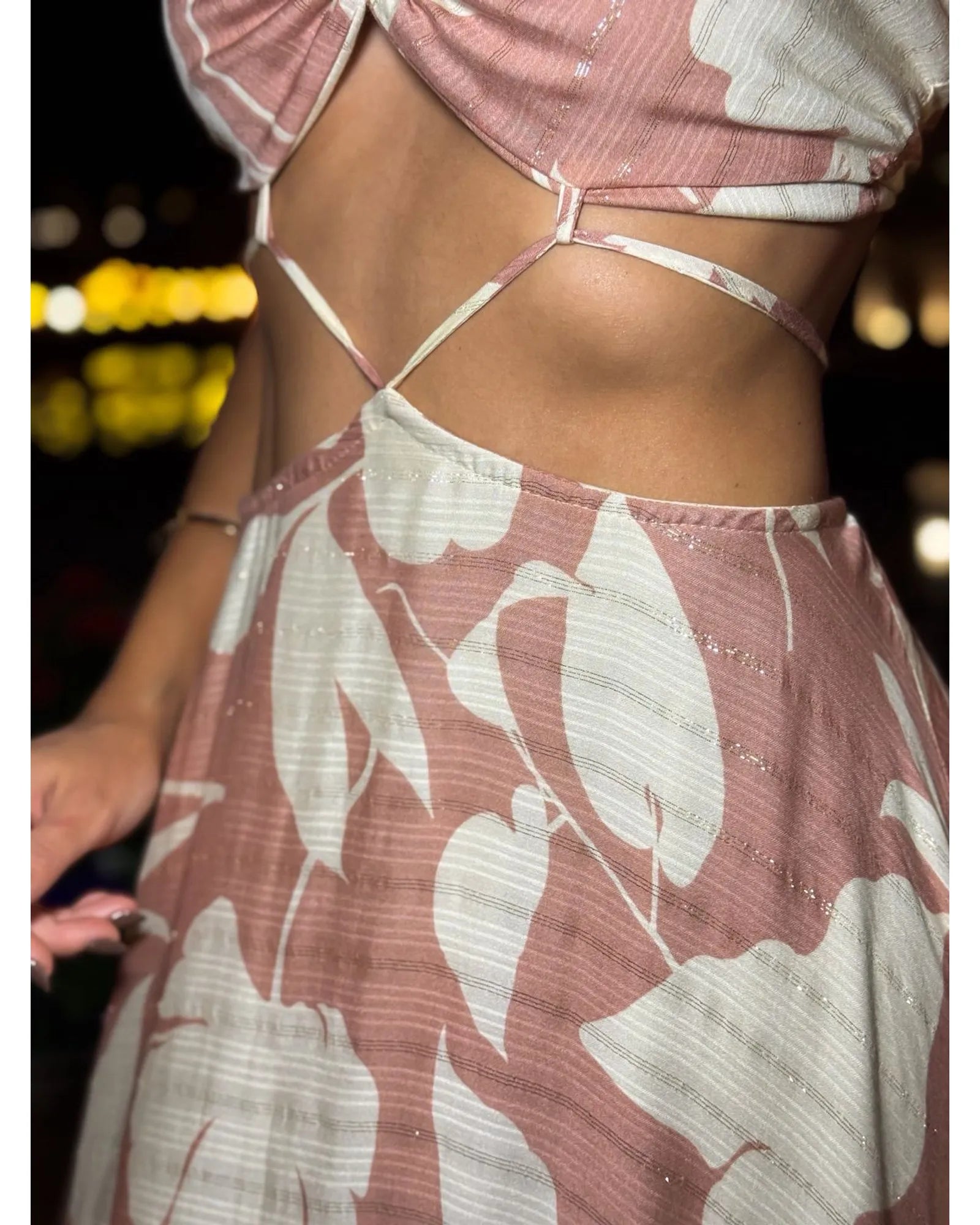 Este vestido é a definição de elegância leve e descomplicada. Confeccionado em viscose fluida com toque macio e caimento impecável, ele ganha ainda mais charme com delicados fios de lurex que percorrem toda a peça, adicionando um brilho sutil e sofisticado. Seu design esbanja feminilidade com recortes estratégicos que revelam a silhueta de forma equilibrada e sensual, enquanto a estampa floral em tons suaves traz um ar romântico e moderno. O busto drapeado é unido por uma argola central que conecta as alças ajustáveis, formando uma amarração delicada nas costas, que além de garantir segurança, valoriza o colo e permite um caimento sob medida. A saia longa, com leve volume e movimento fluido, possui zíper invisível na parte de trás, garantindo praticidade sem abrir mão da estética. Ideal para produções sofisticadas em eventos ao pôr do sol, jantares especiais ou destinos paradisíacos.